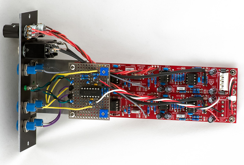 The CGS-504 PCB did not have provisions for a gate output so I added a dual comparator and LED driver. The trimmers allow the envelope level to be set for the gate function. I used 12 mm potentiometers to fit the available panel space.