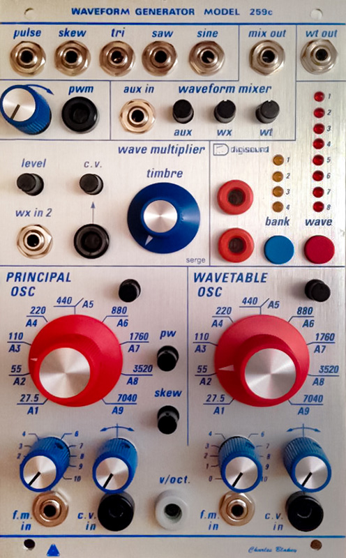 I consulted on the repair of a 259C Waveform Generator prototype that apparently never worked properly. This module has a principle oscillator based on the Thomas Henry X-4046 VCO, a waveform oscillator based on the Digisound80 which is a CEM3440 VCO with a 32 waveform EPROM, and a Serge wave multiplier. There is some information on the Muffwiggler topic Buchla 259c ? A mix between wavetable and analog. I know nothing more of this module.