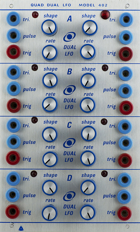 I was sent a 402 Quad Dual LFO module to repair. I've never seen one of these before and there is very little information on the web. I don't even know who the logos on the panel are for. Two of the LFOs (right side B and D) had significantly faster rates and had other issues at the lowest frequency.