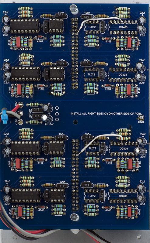 The design is very symmetrical as can be seen on the PCB rear. I determined that the 22 uF capacitors for two bad oscillators had no +15V connected to them so this was a PCB design issue. I don't know who did this design but suspect that there were modifications needed that were never made by the builder. What was amazing is the waveform would morph from a nice triangle to a very nice rail to rail sine wave at the lower frequencies. The other interesting aspect of this module is that the right side panel is a mirror image including the controls. They operate with the opposite rotation so in the above image all eight LFOs are set to the same shape and rate.
