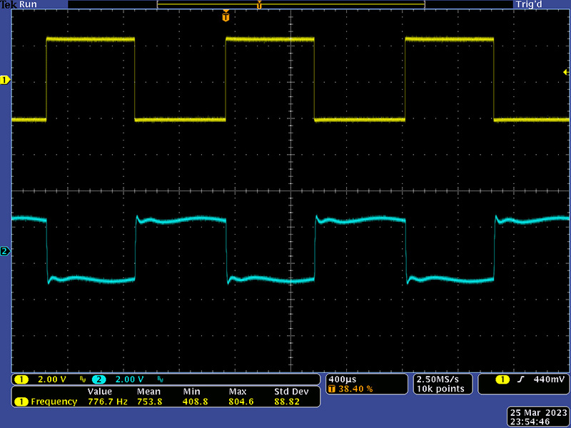 The module doesn't provide a hard split between the comb filter outputs. This scope image shows the Comb ↓output with the 777 Hz control set to minimum.